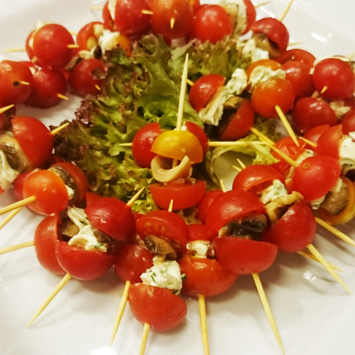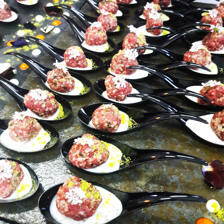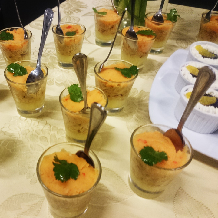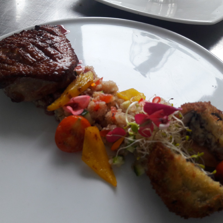 Pato sellado, camarones al coco y aranccinni de champiñones